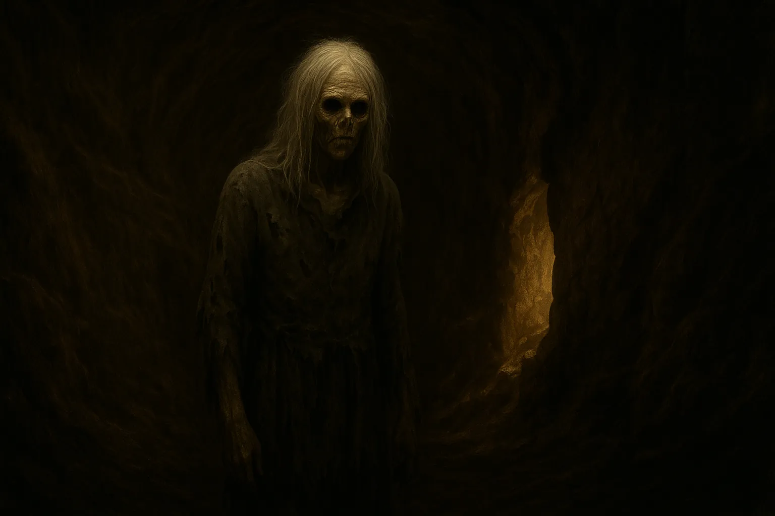 Hubo tres golpes más fuertes que el resto y se abrió una abertura en la pared por la que se colaba una tenue luz. Distinguí bajo el hueco una desgarbada silueta de brazos delgados y largas piernas. La sangre se me heló. El olor a ropa húmeda y azufre ganó intensidad conforme aquella criatura se acercaba. Se agachó junto a mí y puso su cara frente a la mía. Me costaba respirar por el olor. Inclinó su cabeza a un lado y, en ese instante, un rayo me mostró el rostro del mismísimo príncipe de las tinieblas. En lugar de ojos tenía dos oscuros y profundos agujeros, la larga melena era blanca y raída, la escasa piel de sus mejillas parecía a punto de desprenderse y por los huecos que habían dejado los dientes en su boca se colaba una siniestra carcajada. Si el horror no me mató fue porque un golpe en la nuca me sumió en la más siniestra de las pesadillas.